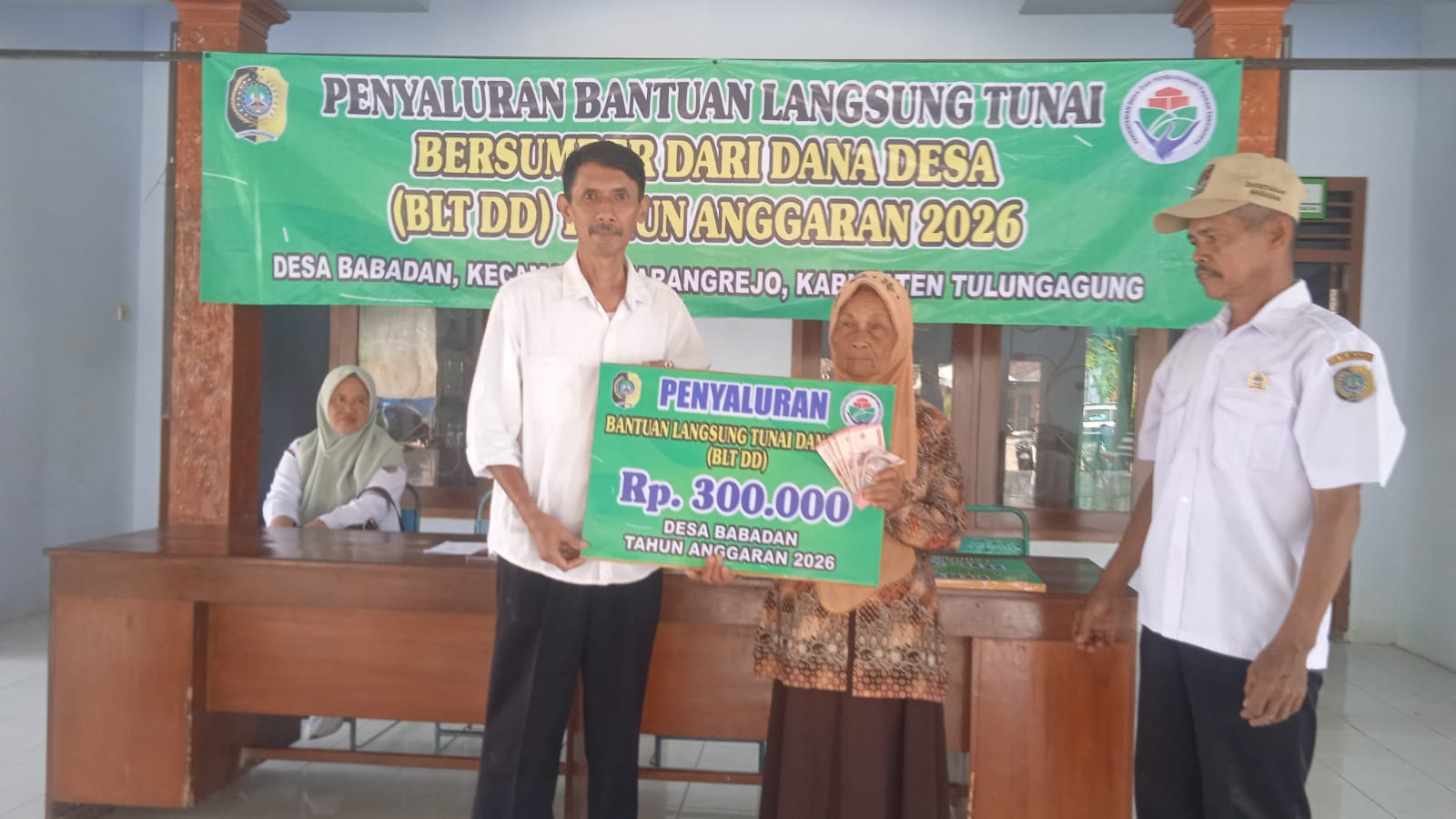 Kepala Desa Babadan Suyitno menyerahkan Bantuan Langsung Tunai Dana Desa Tahun Anggaran 2026 kepada salah satu Keluarga Penerima Manfaat di Balai Desa Babadan, Kecamatan Karangrejo, Kabupaten Tulungagung, Selasa 25 Februari 2026. Pada tahap pertama, delapan KPM menerima Rp900.000 untuk alokasi Januari hingga Maret 2026.