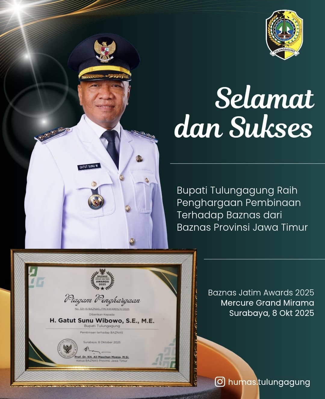 ANALISA PUBLIK.id ! Tulungagung – Badan Amil Zakat Nasional (BAZNAS) Kabupaten Tulungagung mengucapkan selamat dan sukses kepada Bupati Tulungagung, H. Gatut Sunu Wibowo, S.E., M.E., atas diraihnya Penghargaan BAZNAS Jatim Award 2025 pada Kriteria Pembinaan terhadap BAZNAS.