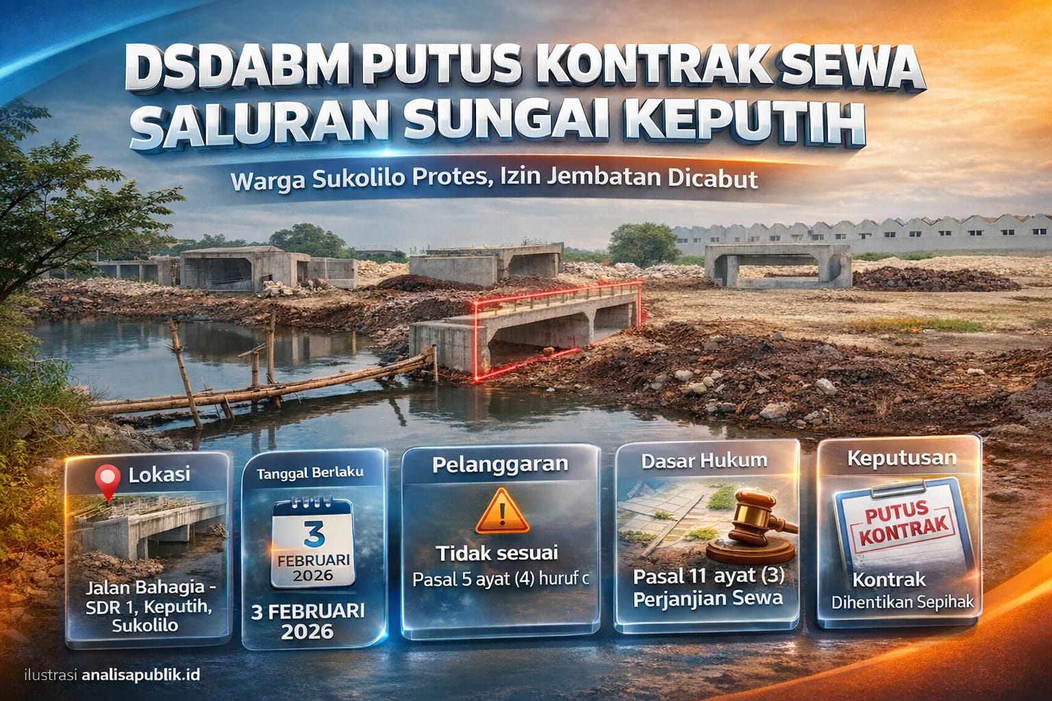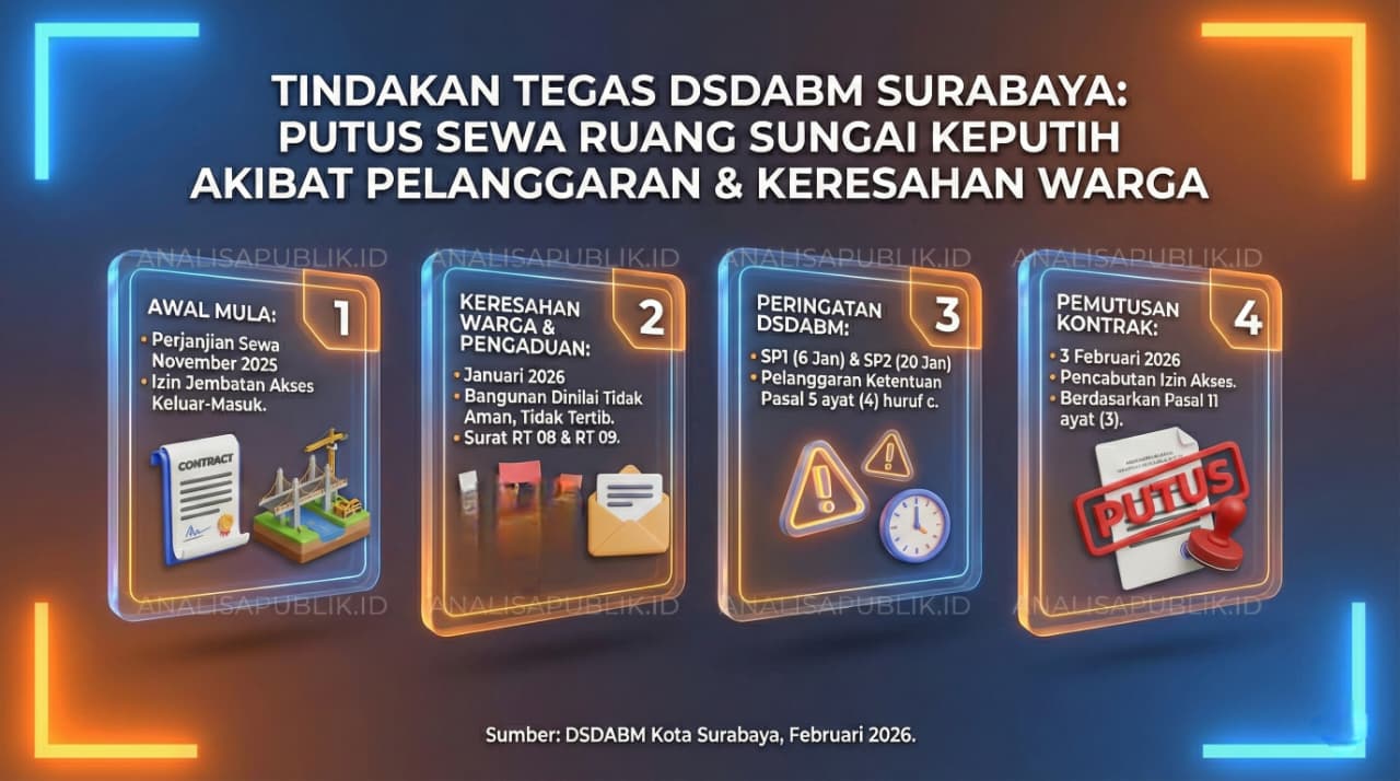 KETERANGAN FOTO: Infografis ini menampilkan kronologi tindakan tegas DSDABM Surabaya memutus kontrak sewa ruang di atas saluran Sungai Keputih pada 3 Februari 2026. Pemutusan sepihak ini dilakukan akibat pelanggaran ketentuan pembangunan jembatan akses yang terus memicu keresahan warga setempat, meski telah diberi peringatan. (Sumber: DSDABM Kota Surabaya/Grafis: analisapublik.id)