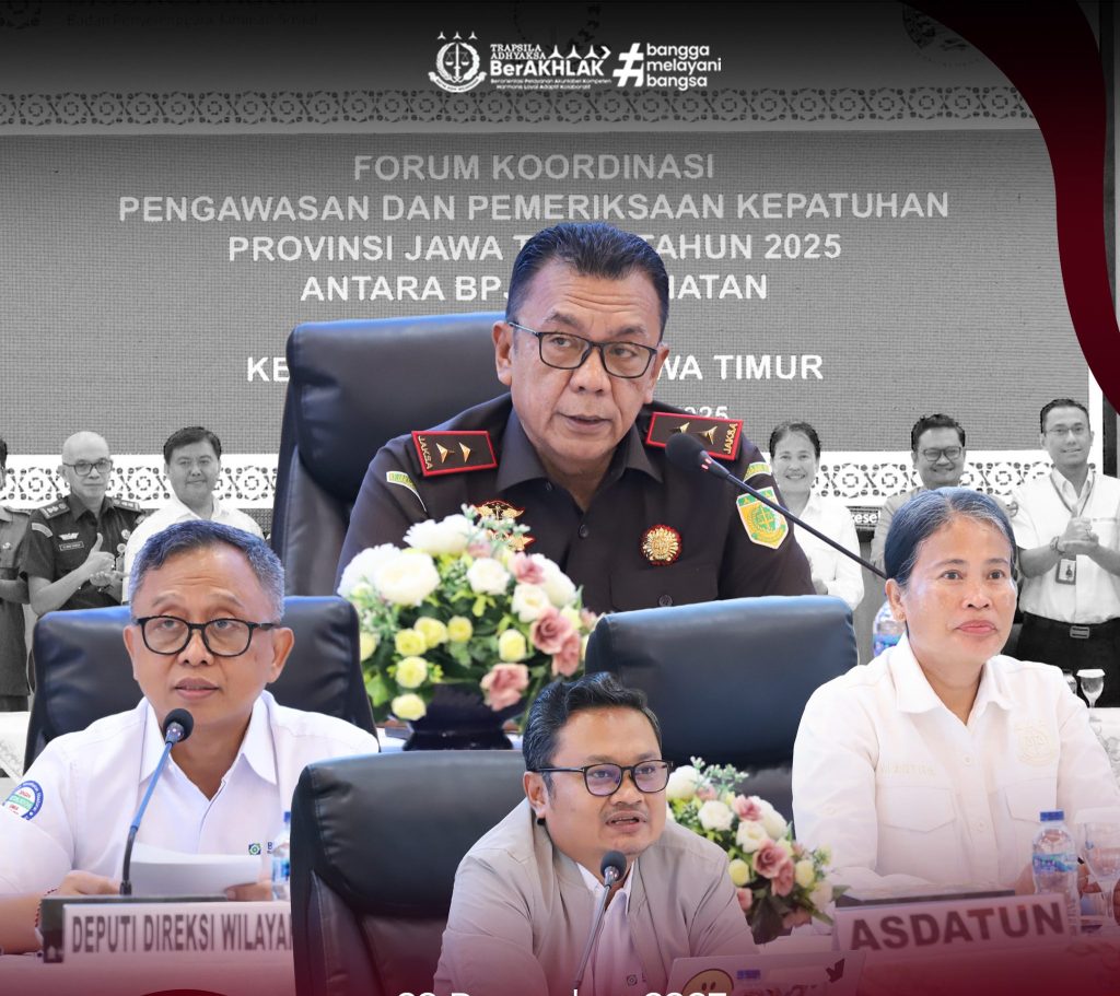 Surabaya – Kejaksaan Tinggi Jawa Timur bersama BPJS Kesehatan Wilayah Jawa Timur terus memperkuat sinergi dalam pengawasan dan pemeriksaan kepatuhan penyelenggaraan Program Jaminan Kesehatan Nasional (JKN) Tahun 2025 melalui Kegiatan Forum Koordinasi yang digelar di Aula Sasana Adhyaksa, Senin (29/12/2025).
