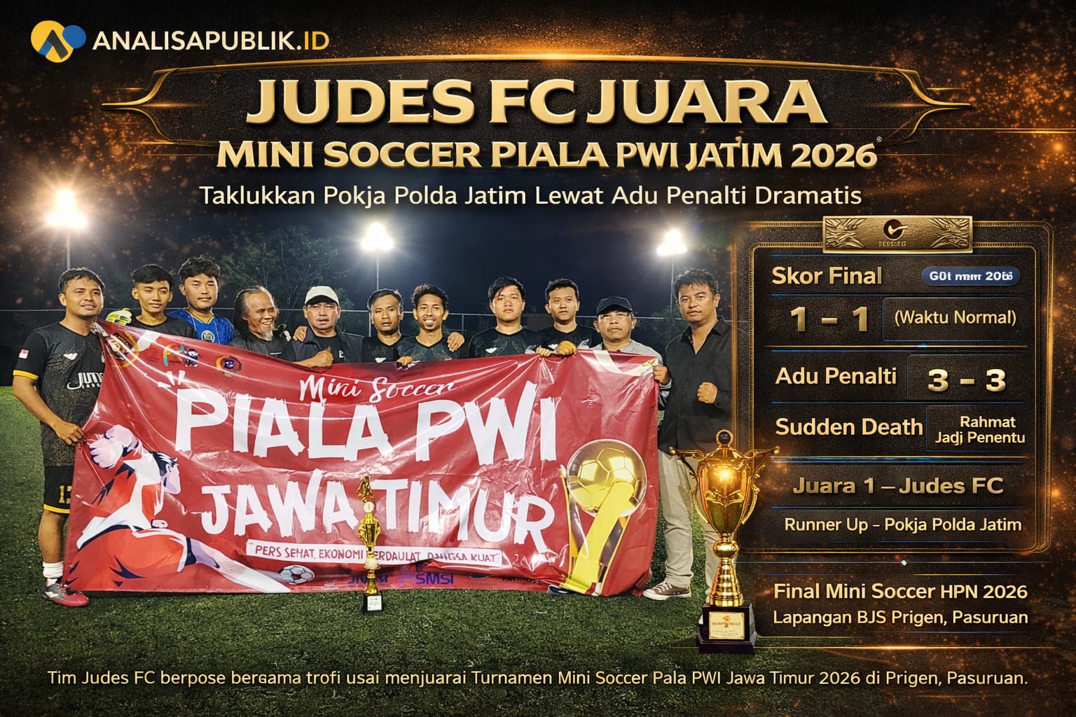 SURABAYA – analisapublik.id | Judes FC memastikan gelar juara Turnamen Minisoccer Piala PWI Jawa Timur 2026 setelah menaklukkan tim Pokja Polda Jatim lewat drama adu penalti. Laga final berlangsung di Lapangan BJS, Prigen, Pasuruan, Sabtu malam 14 Februari 2026.