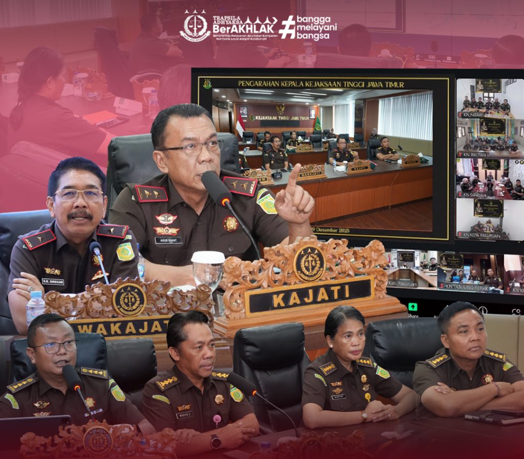 Surabaya – Kepala Kejaksaan Tinggi Jawa Timur, Agus Sahat ST, S.H., M.H., didampingi Para Asisten, memberikan pengarahan secara daring kepada para Kepala Kejaksaan Negeri se-Jawa Timur beserta jajaran dalam rangka evaluasi dan penguatan kolaborasi kinerja di wilayah hukum Kejati Jatim, Selasa (9/12/2025).