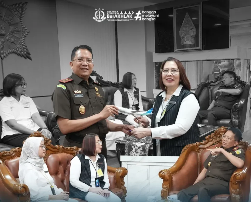 Surabaya – Kepala Kejaksaan Tinggi Jawa Timur, Dr. Kuntadi, S.H., M.H., didampingi Asisten Pembinaan menerima kunjungan audiensi General Manager PT Garuda Indonesia (Persero) Tbk Branch Office Surabaya, Meisye Paulina Tambunan, beserta tim di Ruang Kerja Kajati Jatim, Senin (17/11/2025).