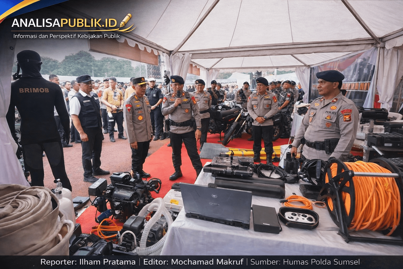 Kapolri Jenderal Polisi Listyo Sigit Prabowo meninjau peralatan operasional kepolisian saat kegiatan Apel Ojol dan Buruh Kamtibmas di Palembang, Sumatera Selatan, Minggu 8 Maret 2026. Dalam kegiatan tersebut ditampilkan berbagai perlengkapan dan sarana pendukung pengamanan yang digunakan oleh jajaran kepolisian untuk mendukung tugas menjaga keamanan dan ketertiban masyarakat di wilayah Sumatera Selatan. Reporter: Ilham Pratama, Editor: Mochamad Makruf, Sumber: Humas Polda Sumsel.