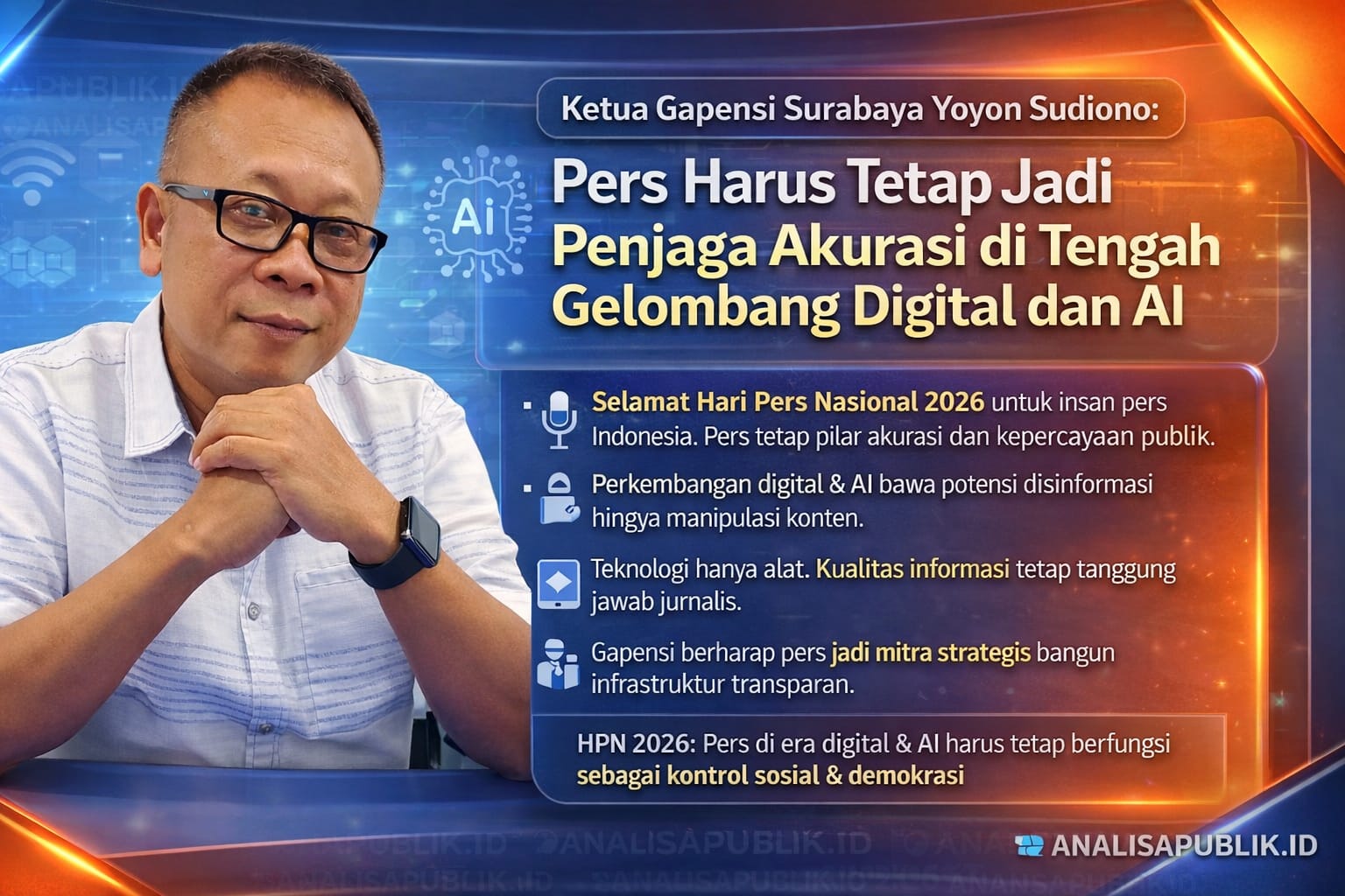 SURABAYA | ANALISAPUBLIK.ID — Peringatan Hari Pers Nasional (HPN) 2026 dimaknai sebagai momentum refleksi atas peran strategis media di tengah derasnya arus digitalisasi dan perkembangan kecerdasan buatan (Artificial Intelligence/AI).