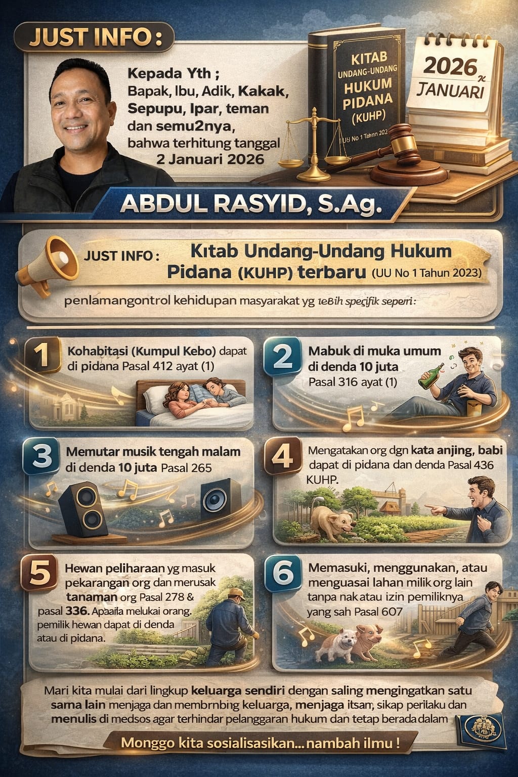 ABDUL RASYID, S.Ag., Aktivis dan Pemerhati Kebijakan Publik, menyampaikan pandangannya terkait pemberlakuan Kitab Undang-Undang Hukum Pidana (KUHP) terbaru yang mulai berlaku pada 2 Januari 2026.