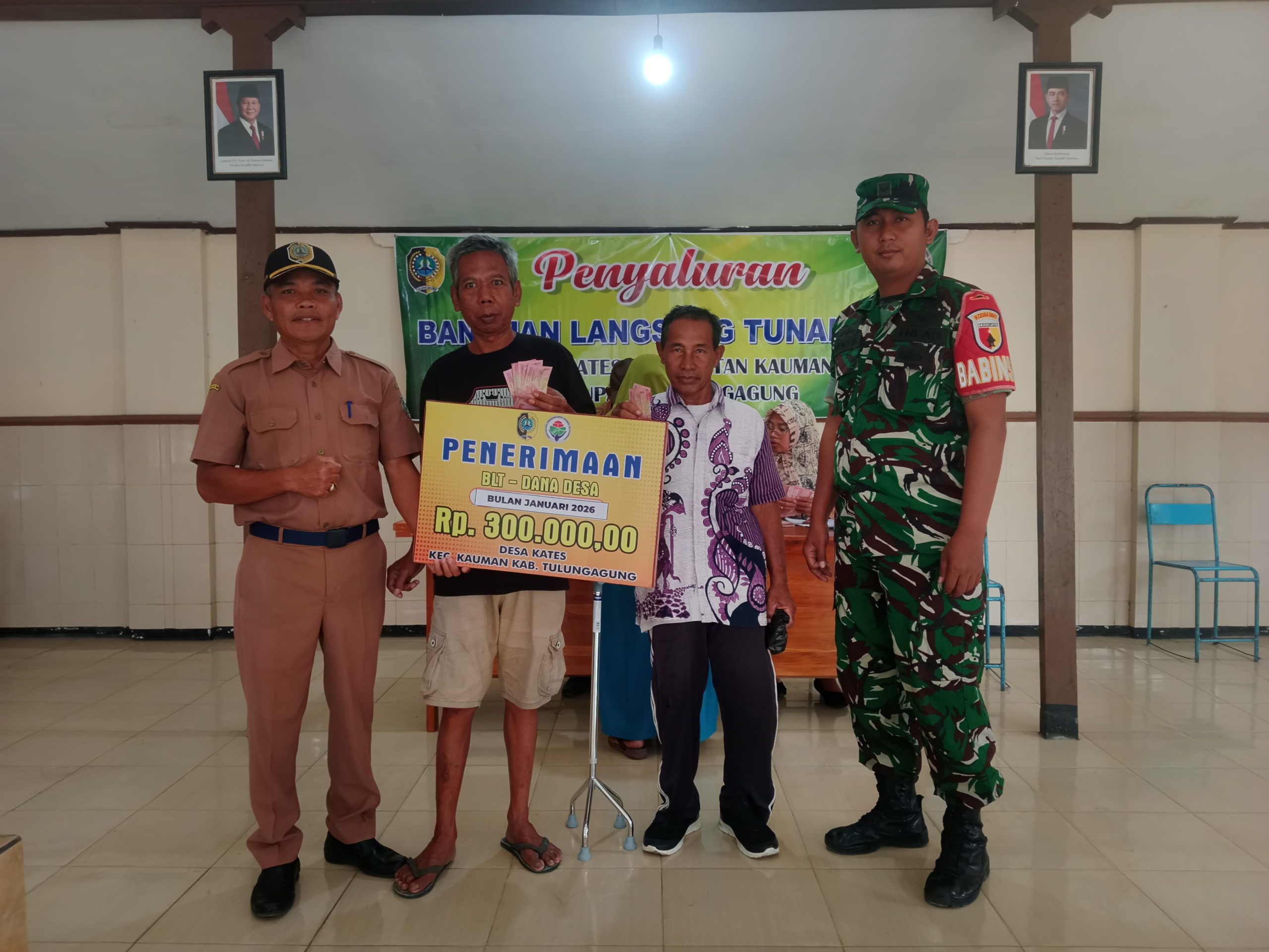 Kepala Desa Kates bersama Babinsa dan perangkat desa mendampingi penyerahan Bantuan Langsung Tunai Dana Desa Tahun Anggaran 2026 kepada salah satu Keluarga Penerima Manfaat di Balai Desa Kates, Kecamatan Kauman, Kabupaten Tulungagung, Selasa 24 Februari 2026.