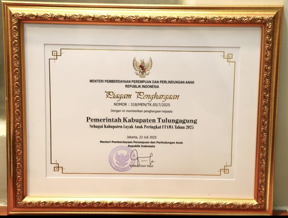 Penghargaan tersebut diserahkan langsung oleh Menteri PPPA RI Arifatul Choiri Fauzi kepada Bupati Tulungagung H. Gatut Sunu Wibowo, S.E., M.E., di Jakarta. pada Jumat (08/08/2025).