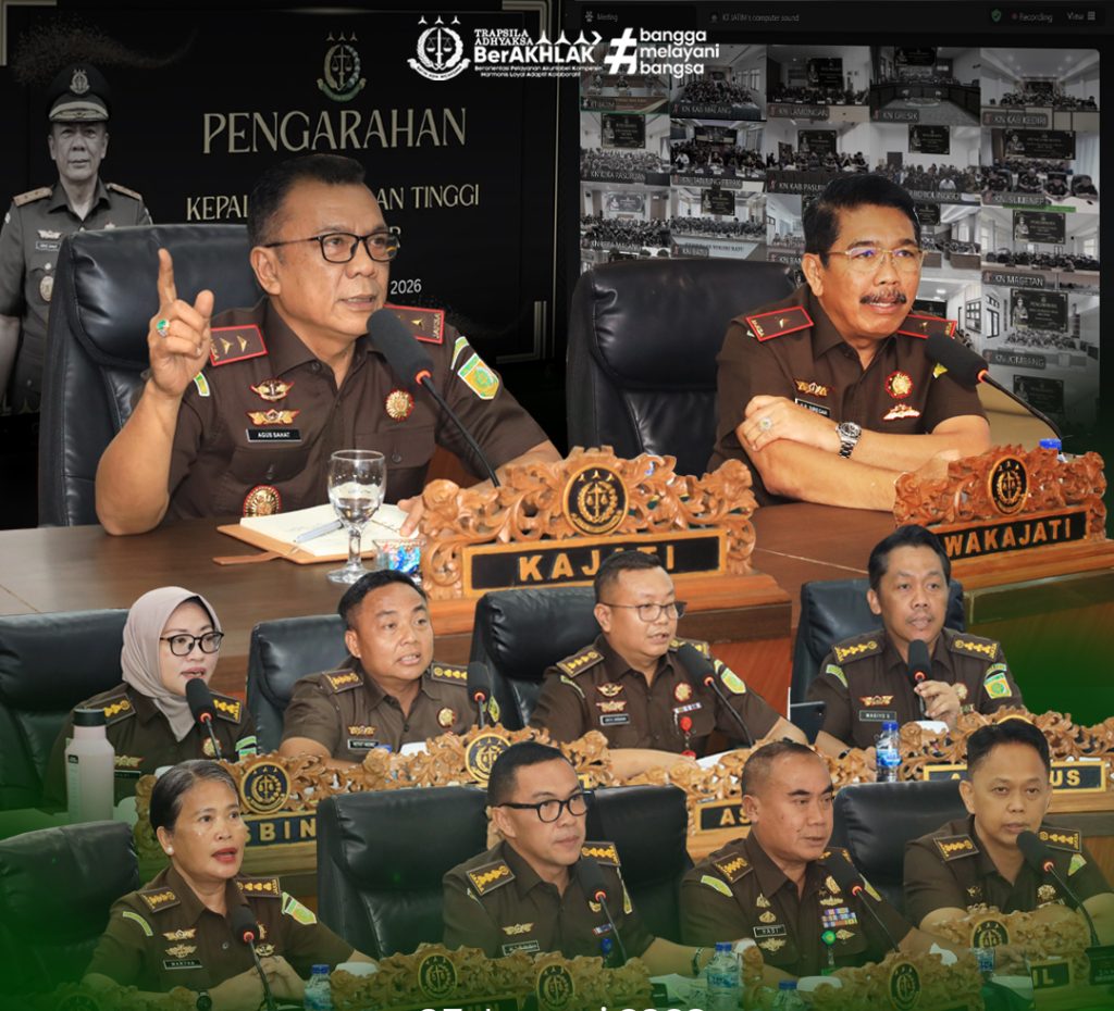 Surabaya – Kepala Kejaksaan Tinggi Jawa Timur, Agus Sahat ST, S.H., M.H., memberikan pengarahan strategis kepada seluruh jajaran Kejaksaan Negeri se-Jawa Timur yang digelar secara virtual dari Ruang Rapat Kajati Jatim, Senin (5/1/2026).