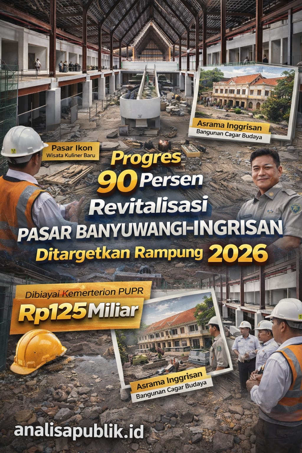 BANYUWANGI – analisapublik.id | Pemerintah Kabupaten Banyuwangi menargetkan proyek revitalisasi Pasar Banyuwangi yang terintegrasi dengan kawasan Asrama Inggrisan dapat diselesaikan pada tahun 2026. Hingga Januari 2026, progres fisik pembangunan dilaporkan telah mencapai sekitar 90 persen.