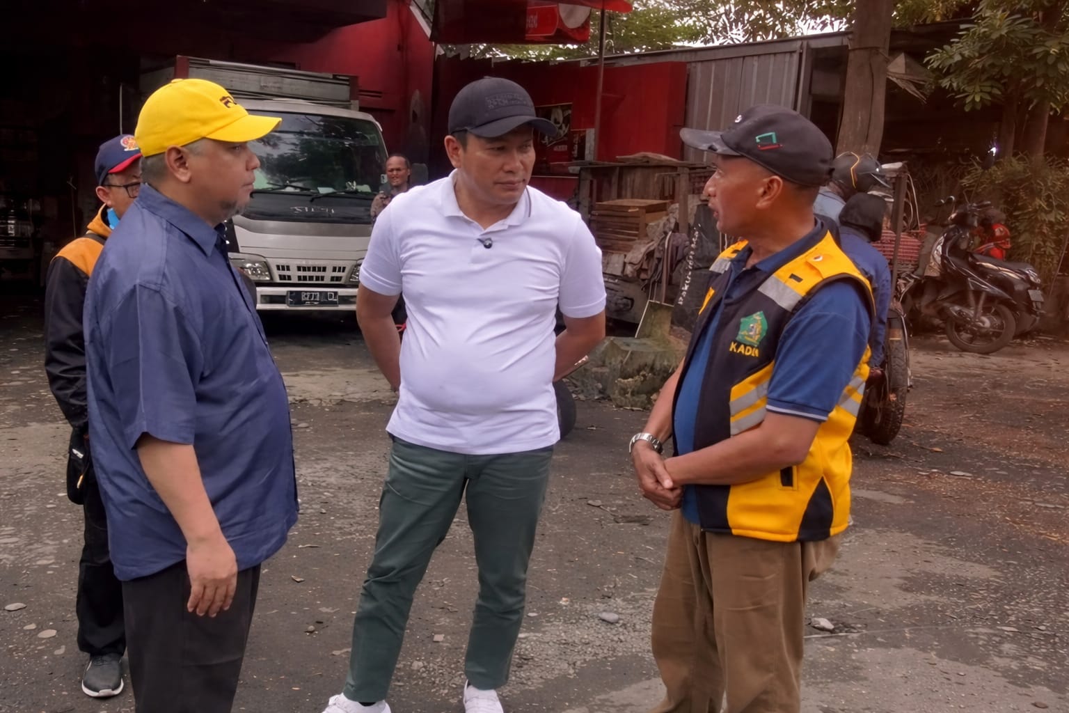 Bupati Sidoarjo Subandi berdialog dengan jajaran Dinas PU Bina Marga saat inspeksi mendadak di ruas Jalan Setia Budi, Kecamatan Krian, Kabupaten Sidoarjo, menindaklanjuti keluhan warga terkait kerusakan jalan dan genangan air yang membahayakan pengendara.