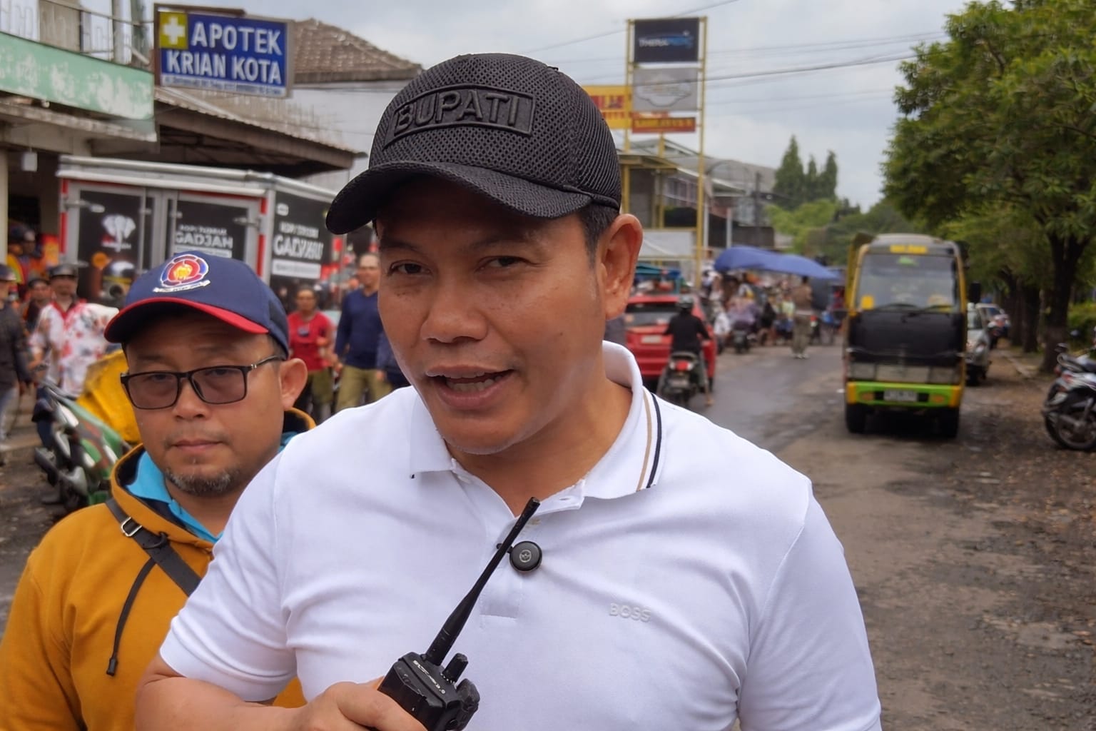 Bupati Sidoarjo Subandi memberikan keterangan kepada awak media saat inspeksi mendadak di ruas Jalan Setia Budi, Kecamatan Krian. Sidak dilakukan untuk memastikan percepatan perbaikan jalan rusak menjelang Lebaran.