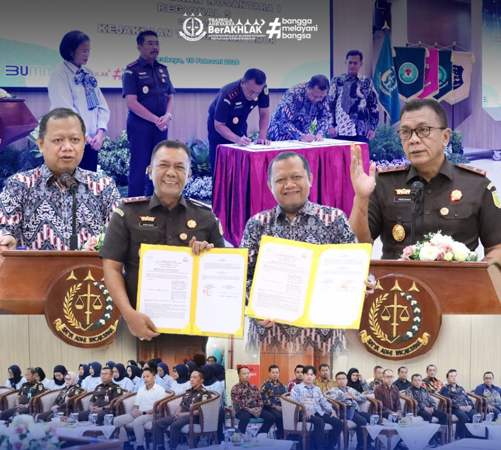 Surabaya – Kejaksaan Tinggi Jawa Timur bersama PT Perkebunan Nusantara (PTPN) I Regional 5 secara resmi menjalin kerja sama di bidang Perdata dan Tata Usaha Negara melalui penandatanganan Perjanjian Kerja Sama/Memorandum of Understanding (MoU) yang dilaksanakan di Aula Sasana Adhyaksa Kejati Jatim, Selasa (10/2/2026).