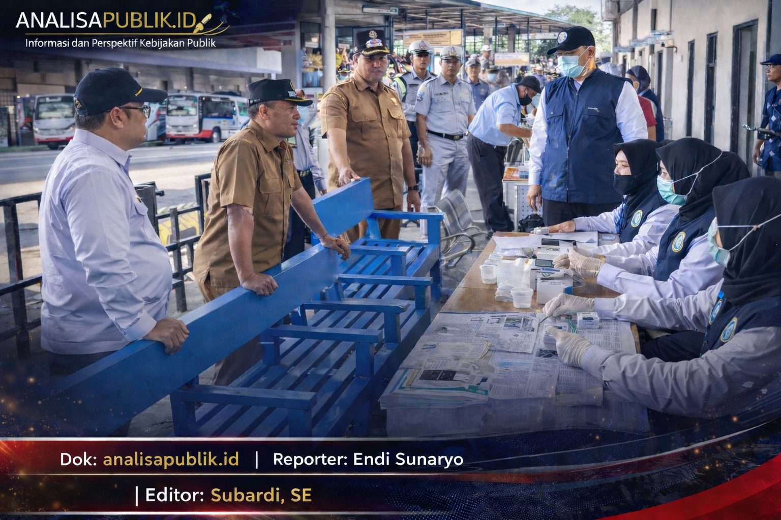 Wakil Bupati Tulungagung Ahmad Baharudin bersama Wakapolres Tulungagung Kompol Arie Taufan meninjau langsung pelaksanaan pemeriksaan kelaikan kendaraan (ramcek) dan tes urine awak bus di Terminal Gayatri, Senin (16/03/2026). Kegiatan yang melibatkan Satlantas Polres Tulungagung, BNNK Tulungagung, Dinas Perhubungan, Dinas Kesehatan, Jasa Raharja, dan Subdenpom V/1-6 tersebut dilakukan untuk memastikan armada laik jalan serta awak bus negatif narkoba menjelang puncak arus mudik dan balik Lebaran 1447 H/2026.